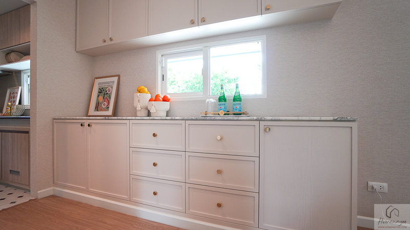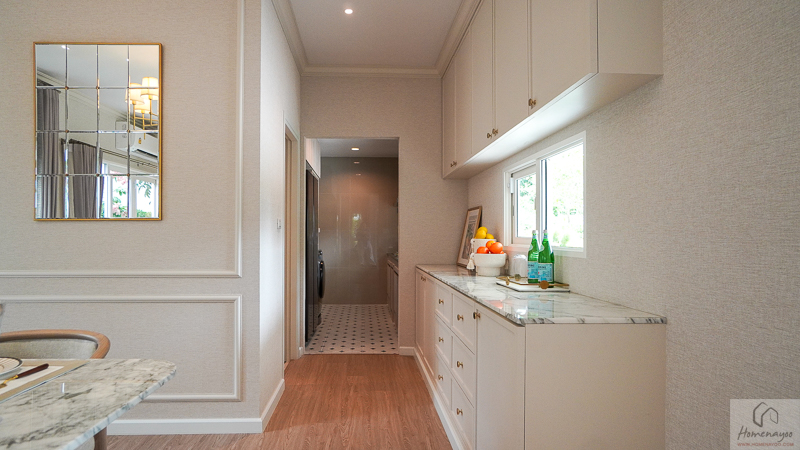 มุมนี้จะได้เป็นพื้นที่แนวยาวเว้นลึกลงไป รองรับการต่อเติม Pantry ติดตู้เก็บของด้านบน จัดเป็นโซนเตรียมอาหาร พักอาหาร อุ่นอาหารง่าย ๆ หรือทำเป็น Coffee Station รวมถึง Mini Bar ได้เลยค่ะ โดยผนังฝั่งหน้าบ้าน จะมีหน้าต่างกระจกบานเลื่อนติดมาให้ด้วย 1 บาน