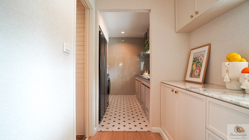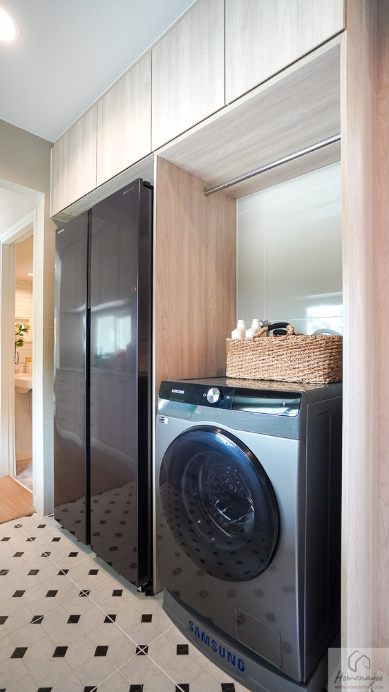 ตรงข้ามกันมีพื้นที่เว้นลึกลงไปไว้สำหรับวางตู้เย็น และวางเครื่องซัก-อบผ้าได้ ด้านหลังจะมีการเดินงานระบบน้ำ ระบบไฟมาให้พร้อมต่อใช้งาน