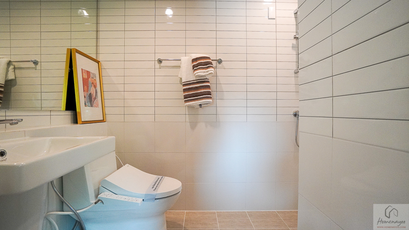 ภายในห้องน้ำได้พื้นที่มาค่อนข้างใหญ่ค่ะ มีการแบ่งส่วนแห้งแยกส่วนอาบน้ำให้เรียบร้อย และตกแต่งกระเบื้องในโทนสีอ่อนเช่นเดียวกันกับห้องอื่น ๆ สุขภัณฑ์ใช้เป็นของ Cotto ติดมาให้พร้อมใช้งาน