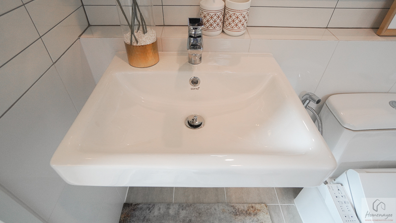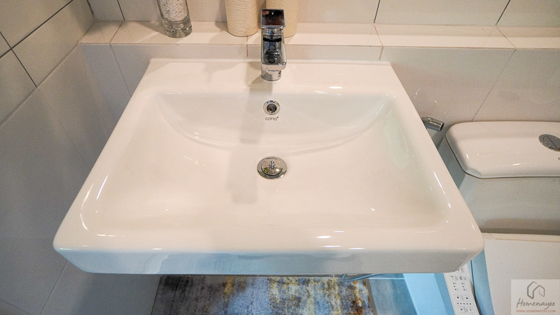 ได้อ่างล้างหน้าทรงเหลี่ยมแบบแขวนผนัง ก๊อกน้ำโครเมียมก้านโยก โดยใต้อ่างจะมีพื้นที่เหลือให้วางถังขยะ หรือชั้นวางของเล็ก ๆ เสริมเข้าไปได้ด้วยค่ะ