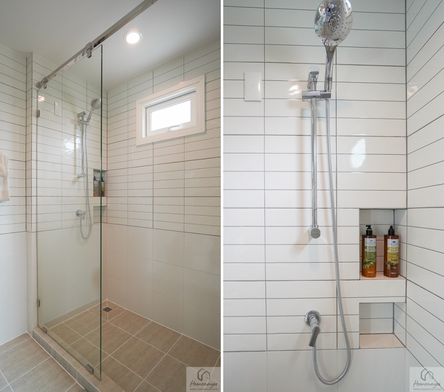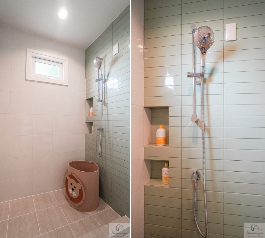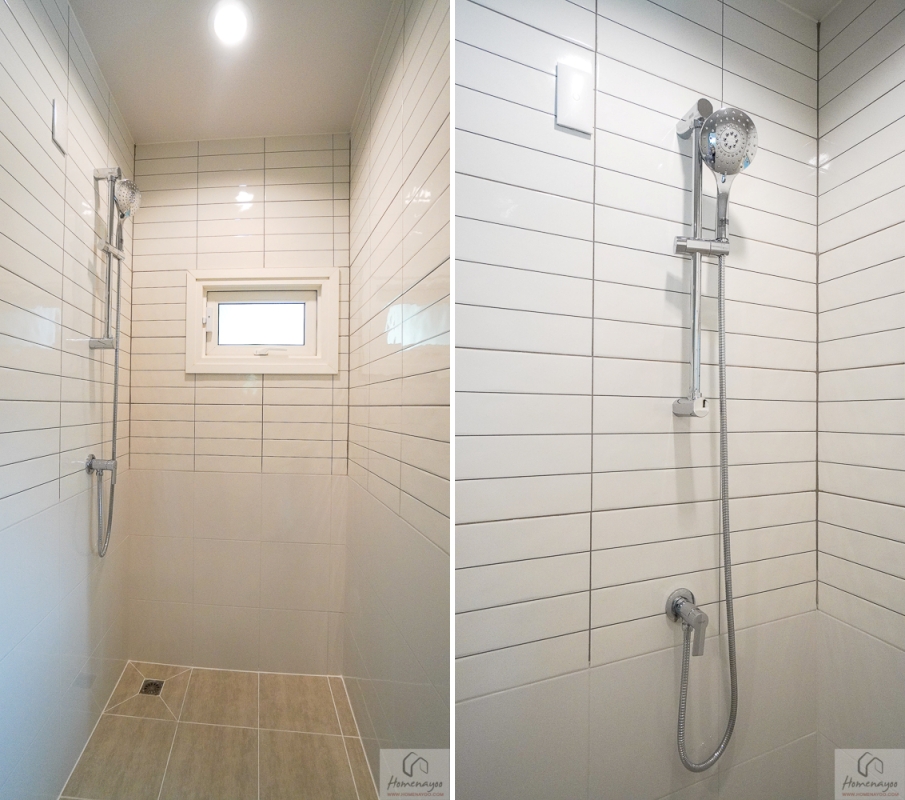 อีกด้านเป็นส่วนอาบน้ำ ติดฉากกั้นกระจก ฝักบัว Hand Shower พร้อมราวปรับระดับ และที่ผนังจะมีการเจาะช่องทำชั้นวางของให้ 2 ชั้น ด้านบนติด Junction Box มาให้ครบ และมีหน้าต่างไว้เปิดระบายอากาศให้ด้วย 1 บานค่ะ
