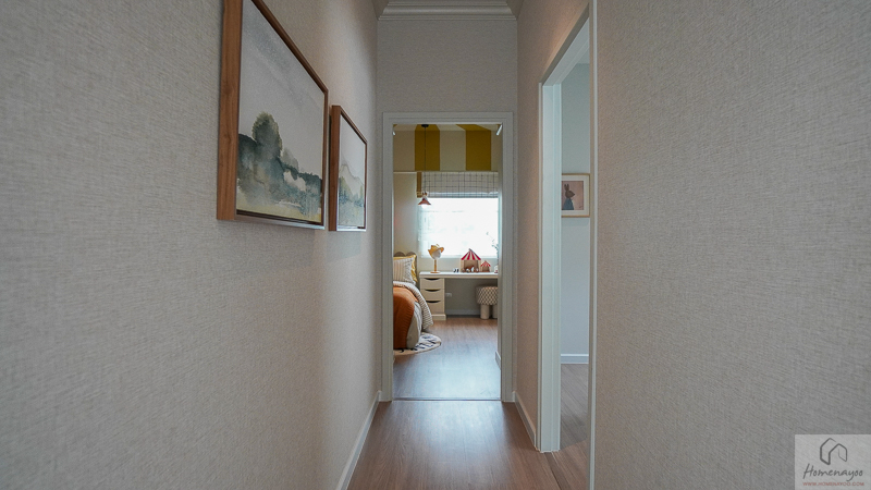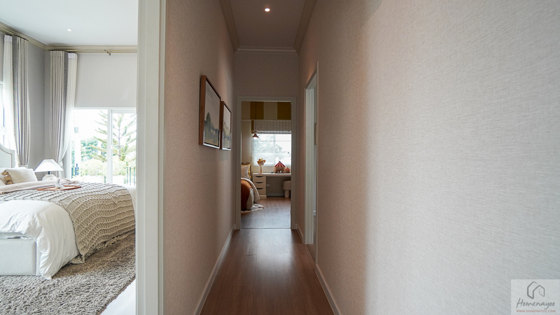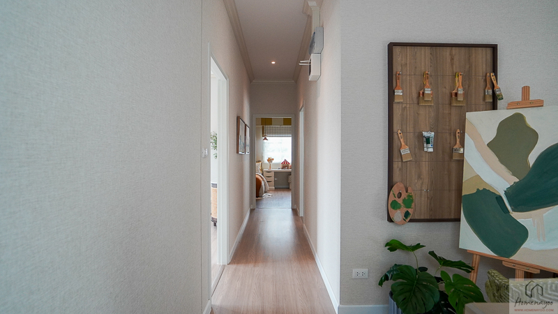 ขึ้นมาที่ชั้น 2 จะเจอกับโถงบ้านแนวยาวที่ใช้เดินเชื่อมกับห้องนอนอีก 3 ห้อง และพื้นที่อเนกประสงค์ตรงโถงบันได ความสูงฝ้าเพดานชั้น 2 อยู่ที่ 2.8 ม. วัสดุปูพื้นเปลี่ยนมาเป็นลามิเนตลายไม้ หนา 8 มม.