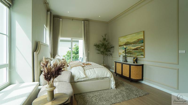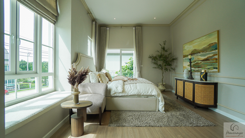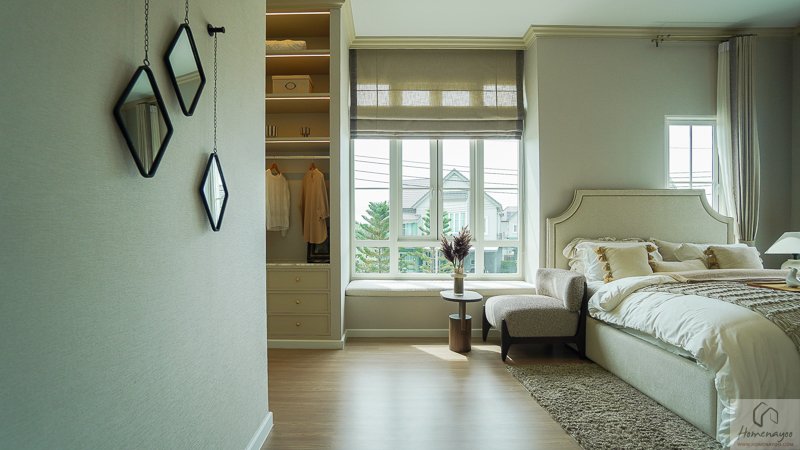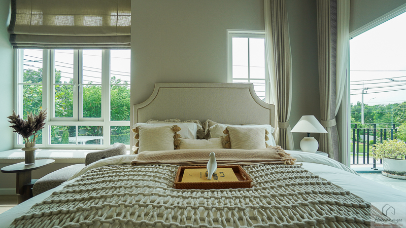 ข้างเตียงนอนบริเวณ Bay Window สามารถเสริมเบานั่ง วางอาร์มแชร์ โต๊ะกลางเล็ก ๆ เพื่อทำเป็นมุมนั่งเล่นพักผ่อนอีกจุดในห้องนอนได้