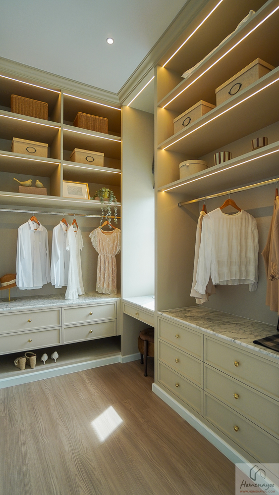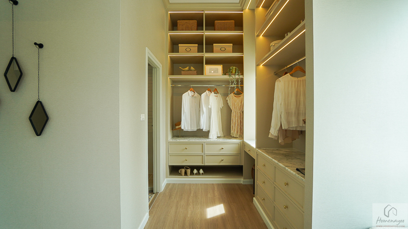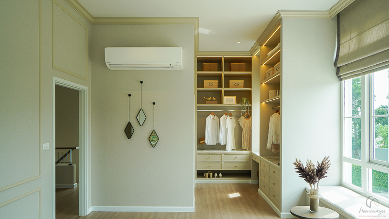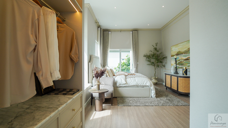 พื้นที่ใช้งานจะสามารถวางตู้เสื้อผ้าขนาดมาตรฐาน และเสริมด้วยโต๊ะเครื่องแป้งแบบ 1 นั่ง วางไว้ชิดหน้าต่างกระจกด้านหลังบ้านได้ โดยที่ตรงกลางจะยังมีพื้นที่คงเหลือให้ยืนแต่งตัว นั่งแต่งหน้า และเดินเข้า-ออกใช้งานห้องน้ำได้สะดวก