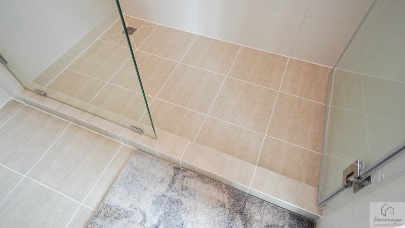 ด้านในสุดเป็นส่วนอาบน้ำ มีการก่อธรณีแยกพื้นที่ไว้ให้ ใครอยากได้ความเป็นสัดส่วนสามารถซื้อม่านกันน้ำหรือฉากกั้นอาบน้ำมาติดได้ภายหลัง และภายในจะมีฝักบัว ราวปรับระดับ ชั้นวางของ Junction Box และหน้าต่างระบายอากาศให้ครบ