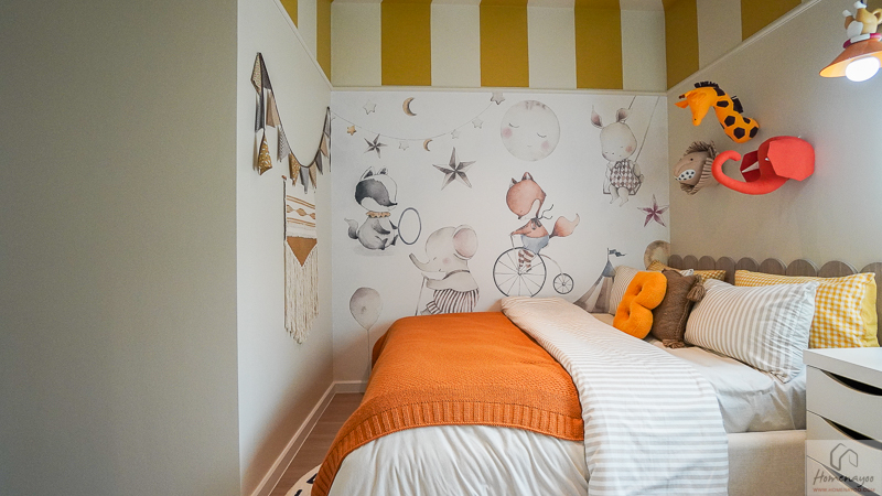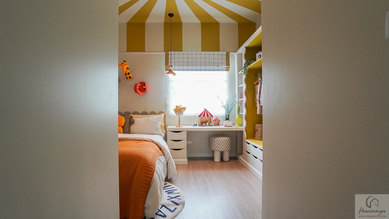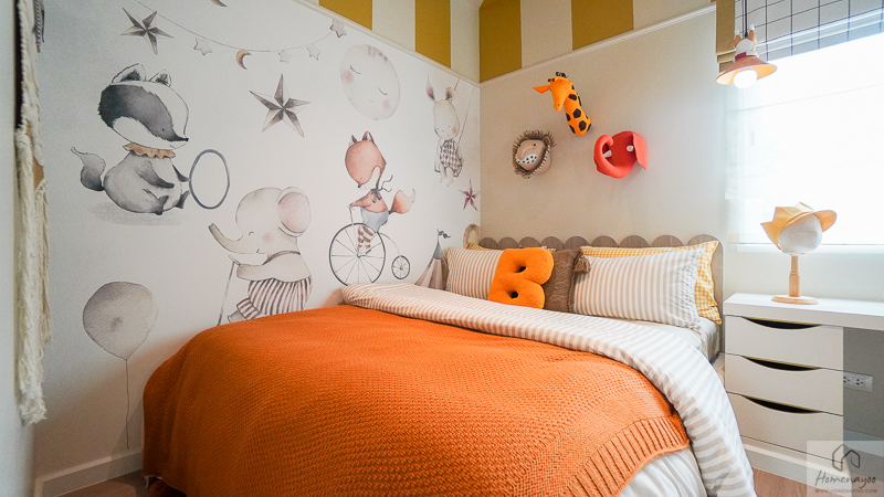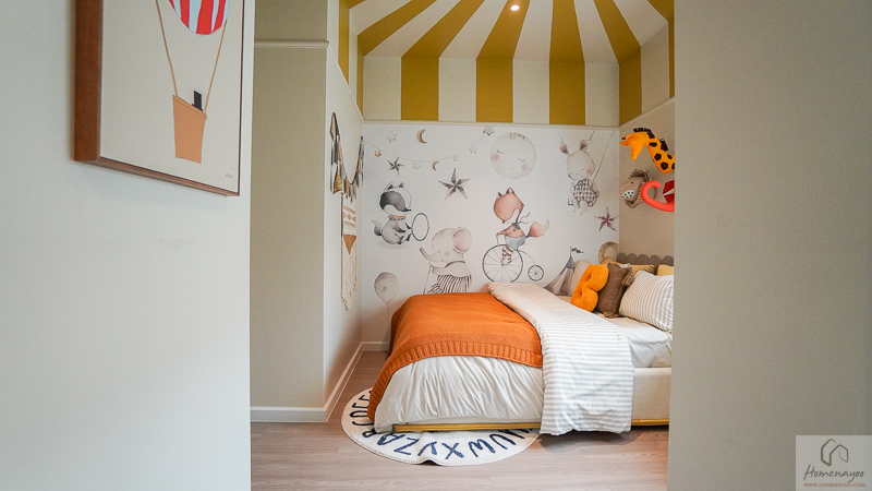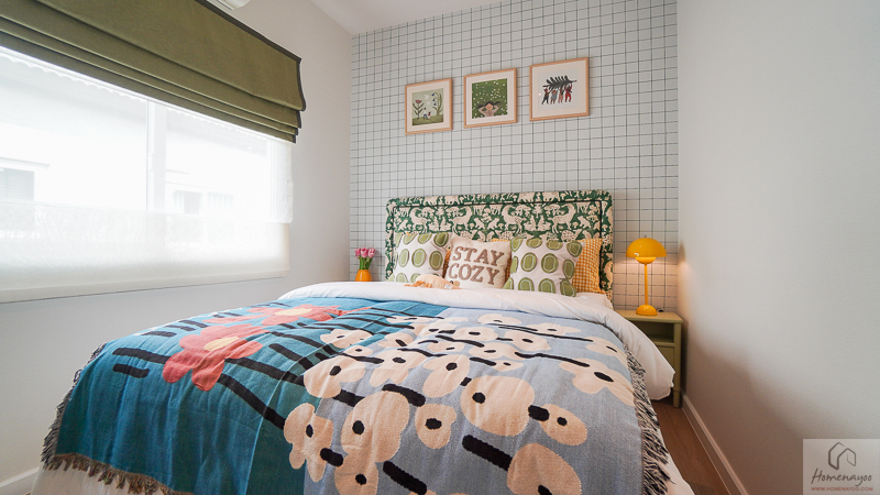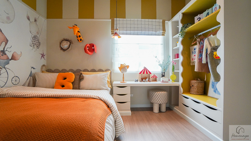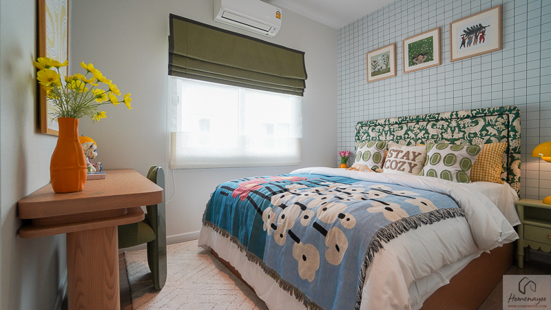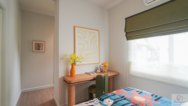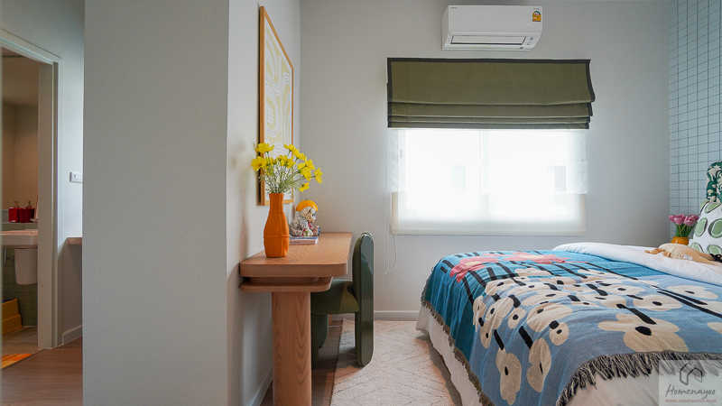 ห้องนี้ตกแต่งเป็นห้องนอนเด็กมาให้ดูเป็นไอเดีย โดยพื้นที่ใช้งานจะสามารถวางเตียงนอน 3.5-5 ฟุตได้สบาย ๆ โดยที่รอบ ๆ ยังมีพื้นที่ให้วางเฟอร์นิเจอร์มาตรฐาน และเดินใช้งานได้สะดวก