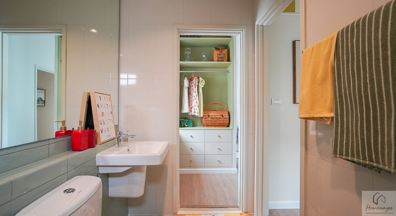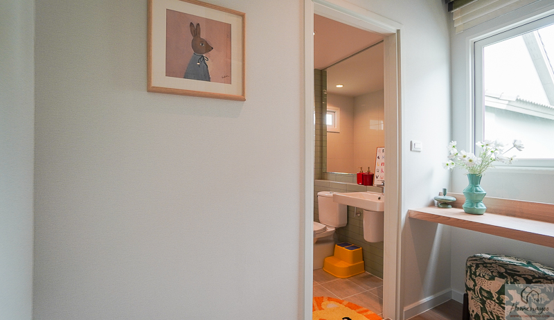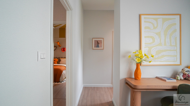 ซ้ายมือเป็นประตูทางเข้าห้องน้ำ ทำให้ได้ฟีลเหมือนว่าห้องนอนรองทั้ง 2 มีห้องน้ำในตัวเลยค่ะ