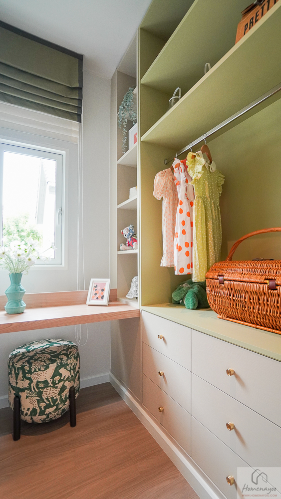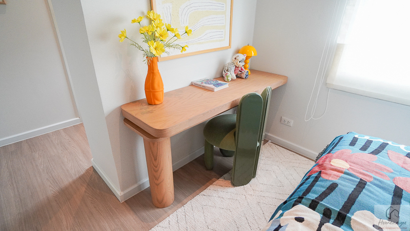 ข้างเตียงนอนมีพื้นที่ให้วางโต๊ะทำการบ้าน และตู้เสื้อผ้าเข้ามุมห้องได้พอดีแบบนี้ และฝั่งข้างบ้านจะมีหน้าต่างกระจกบานเลื่อนขนาดใหญ่ติดมาให้อีก 1 บาน ทำให้ภายในห้องดูโปร่งสว่าง