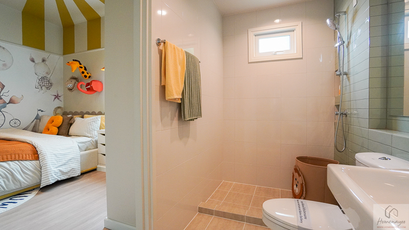 ภายในเป็นห้องน้ำหน้ากว้าง มีการแยกโซนแห้งและโซนอาบน้ำไว้คนละฝั่งชัดเจน พร้อมตกแต่งกระเบื้องเล่นลายโทนสีอ่อน ๆ ดูสะอาด สว่างตา และใช้สุขภัณฑ์มาตรฐานทั้งหมดจากแบรนด์ Cotto