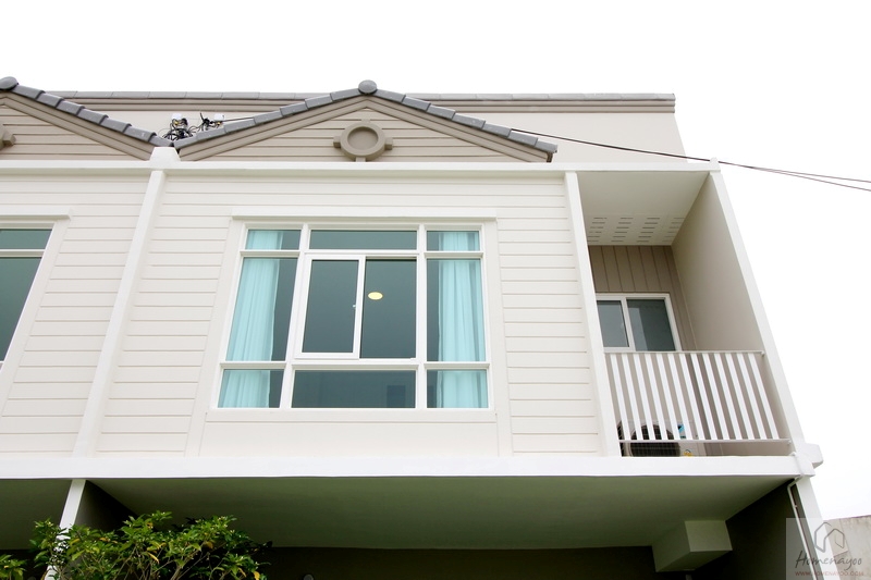 ส่วนฝั่งหน้าบ้านจะได้หน้าต่างกระจกบานผสมชุดใหญ่ ที่มีทั้งแบบบานเลื่อน และบานฟิกซ์ รับแสงได้เยอะดี ซ้ายมือมีช่องแสงกระจกแบบ Bay Window เพิ่มมาให้อีก 1 ชุด ยิ่งขับให้ห้องดูกว้างมากขึ้น