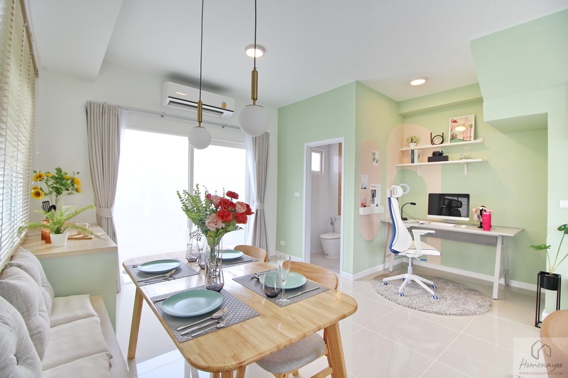 ถัดจากห้องนั่งเล่นเข้าไปจะเป็นพื้นที่อเนกประสงค์ โดยทางโครงการตกแต่งเป็นห้องทำงาน และมุมนั่งเล่นพักผ่อนอีกจุดมาให้ดูเป็นไอเดีย