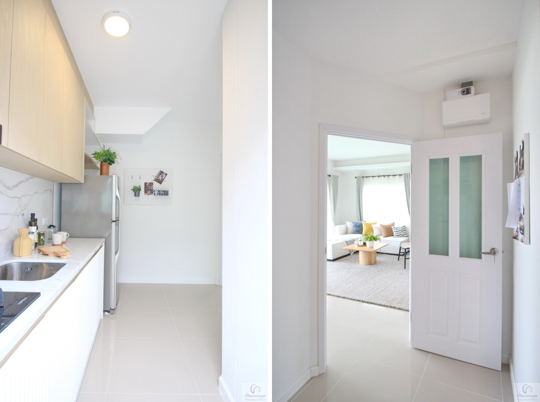 เข้ามาด้านในบ้านจะเจอกับห้องนั่งเล่นเป็นอันดับแรก ต่อเนื่องไปเป็นพื้นที่อเนกประสงค์ ความสูงฝ้า-เพดานอยู่ที่ 2.8 ม. ผนังบ้านฉาบเรียบทาสีขาว ฝ้าเพดานมีทั้งแบบฝ้าหลุม และฝ้าเรียบ ได้โคมไฟ Led ทรงกลมของ Racer ทั้งหลัง พื้นบ้านชั้นล่างในบ้านจริงจะปูพื้นด้วยกระเบื้อง SPC ลายไม้ ที่ให้ความรู้สึกอบอุ่นเหมาะกับการพักผ่อน และยังได้ความแข็งแรง เดินสบายเท้า ทนน้ำ ทนชื้นได้ดี