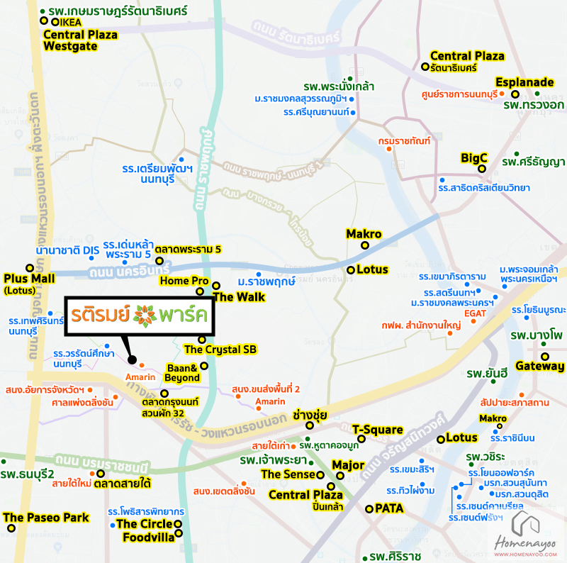 ใกล้สถานศึกษา และ โรงพยาบาลชั้นนำ เช่น รร.วรรัตน์ศึกษา นนทบุรี, รร.อนุบาล เด่นหล้า, รร.เทพศิรินทร์ นนทบุรี, รพ.ธนบุรี 2, รพ.เจ้าพระยา, รพ. ตา หู คอ จมูก, รพ. ศิริราช และ รพ.บางกรวย 2