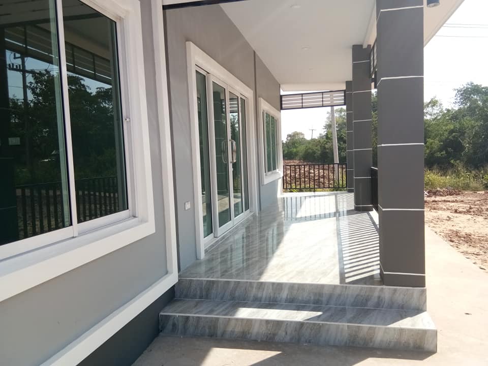 ระเบียงพักผ่อนหน้าบ้านขนาดใหญ่ ปูพื้นกระเบื้องลายหินอ่อน พร้อมติดราวกันตกเหล็กระแนงแนวตั้งทาสีกันสนิม
