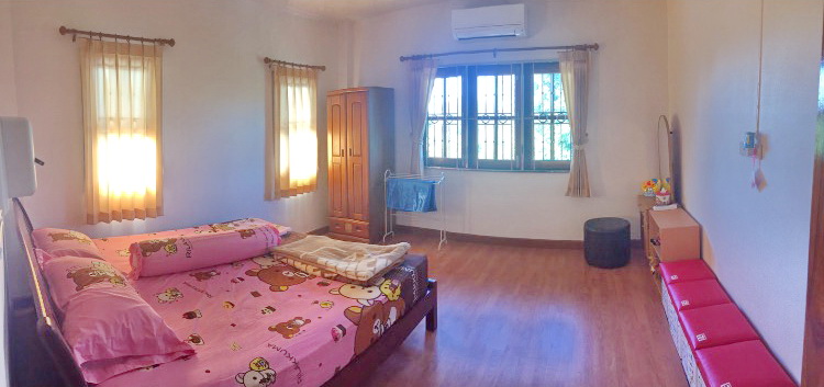 ส่วนชั้นบน สถาปนิกออกแบบห้องนอนขนาดใหญ่โซนด้านหน้าบ้าน ซึ่งเราคิดว่าหากไม่กั้นห้องนี่ต้องซื้อแอร์ขนาดบีทียูสูงหน่อย นอนคนเดียว เปลืองค่าไฟมากไปมั๊ง จึงคิดออกแบบให้มีประตูบานเลื่อนกั้นครึ่งห้อง คือเวลาไม่ได้เปิดแอร์ก็สามารถเปิดโล่งถึงกันได้