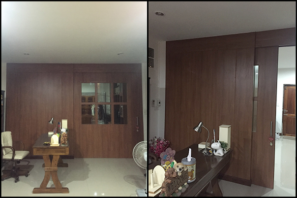 จากนั้นเราส่องหาไอเดียจากในอินเตอร์เนต แล้วคุยกับช่างที่รับจ้างค่ะ โดยเป็นช่างที่มารับจ้างทาสีฝ้า เค้าบอกว่าเค้ารับทำบิวท์อินด้วย ก็เลยติดต่อใช้บริการตกลงราคาอยู่ในงบที่เราตั้งไว้ มีต้องจ่ายซื้อวัสดุเพิ่มเติมบ้างนิดหน่อย เช่น มือจับประตูในราคาหลักพันบาทค่ะ ฝีมือดี ผลงานเป็นที่น่าพอใจตามภาพเลยค่ะ