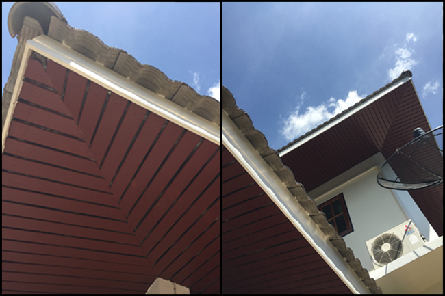 ละรอยรั่วเกิดอยู่มุมหลังคาด้านหลังบ้าน น้ำไหลผ่านแผ่นชนวนกันร้อนไหลลงมาตกตรงฝ้าหลังคาช่วงห้องน้ำชั้นบนซึ่งอยู่ตรงช่วงกลางตัวบ้าน ตอนแรกช่างแก้ไขก็พยายามหาจุดรั่วตรงๆ ในบริเวณหลังคาที่ตรงห้องน้ำ หาอยู่นานสองนานก็หาไม่เจอ ต้องตัดแผ่นชนวนกันร้อนใต้หลังคาไล่ดูรอยน้ำจึงเจอว่าจุดรอยรั่วอยู่ตรงบริเวณหลังบ้านค่ะ