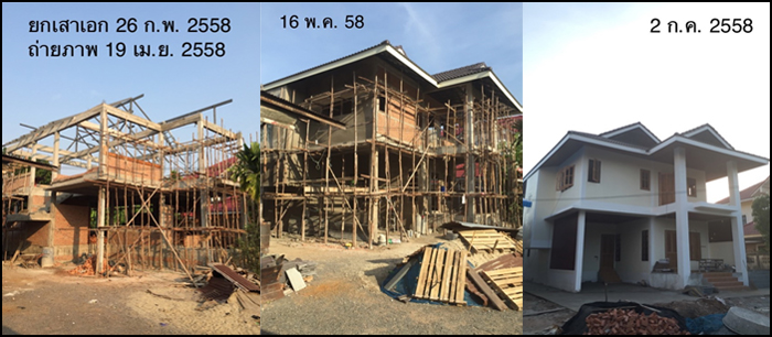 ผลออกมาได้แบบแปลนบ้านสองชั้นขนาดสามห้องนอน สองห้องน้ำ พื้นที่ใช้สอยรวมเบ็ดเสร็จ 200 ตรม. น้าให้เหตุผลว่าจะสร้างทั้งทีเพิ่มตังค์อีกหน่อยเอาซักสองร้อย ตรม.ไปเลย พอเห็นแปลนบ้านนี่ปาดเหงื่อเลยค่ะ งบที่มีอยู่ในกระปุกหมูออมสินไม่พอแน่นอน นึกถึงที่มีคนเค้าเคยพูดบอกว่าเวลาสร้างบ้านไม้โทมันจะหายจาก “บ้าน” กลายไปเป็น “บาน” นี่จริง ๆ ค่ะ ซึ่งประสบกับตัวเองมาแล้วค่ะ ต้องกู้เงินมาสมทบเพื่อบ้านหลังแรกหลังนี้