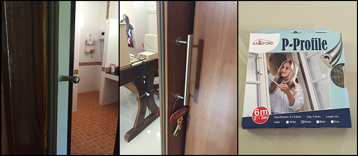 กลับมามีสาระต่อ ข้อควรระวังก็คือ เวลาไสไม้ใหม่ให้ช่างไม้ไสให้พอดีๆ กับขอบวงกบเลยค่ะ ไม่ต้องเผื่อมาก เพราะไม้จะหดตัวลงไปอีกทำให้เกิดเป็นช่องห่างจากขอบวงกบเยอะเลยค่ะ วิธีแก้ไขคือเราไปซื้อขอบยางกันกระแทกสีน้ำตาลที่โฮมโปรมาแปะค่ะ ช่วยได้อยู่ ดูเนียนๆ สวยงามตามภาพเลยค่ะ ซึ่งขอบยางนี้ตอนแรกเราซื้อมาติดกับประตูบานเลื่อนที่ทำบิวท์อิน ช่างเค้าไม่ได้ติดให้ ไปเดินดูที่โฮมโปรเห็นเข้าท่าดีเลยซื้อมาติดกันกระแทก และขยายผลเอามาติดประตูที่หดตัวห่างจากวงกบมากเกินไปได้อีกค่ะ