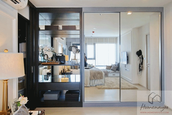 ติดกับห้องน้ำเป็นตู้เสื้อผ้าที่ทางโครงการบิวท์อินไว้ให้ เป็นตู้เสื้อผ้าแบบ 3 บานเปิด หน้าบานกระจกเงา ความกว้าง 1.2 เมตร ความสูงจรดฝ้าเพดาน ภายในแบ่งราวแขวนผ้า + ชั้นวางของ และ ตู้เก็บของไว้ให้ ส่วนด้านล้างมีลิ้นชักเก็บของให้อีก 2 ช่อง เก็บของใช้ได้เยอะทีเดียว