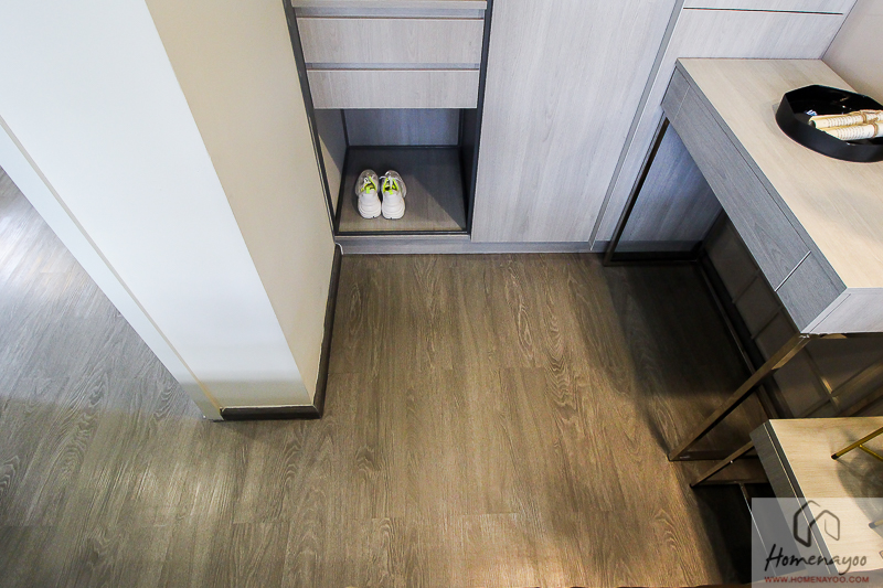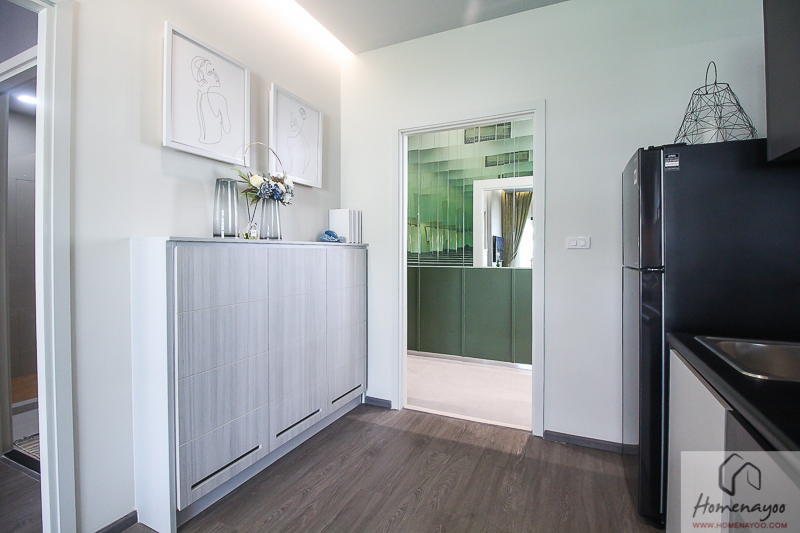 พื้นที่สำหรับยืนทำครัวตรงนี้จะขึ้นอยู่กับการจัดวางเฟอร์นิเจอร์ในห้องของเราเลย อย่างในห้องตัวอย่างเค้าจัดเป็นโต๊ะทานอาหารขนาด 2 ที่นั่ง ก็จะมีพื้นที่เหลือให้ยืนเตรียมอาหารพอประมาณ