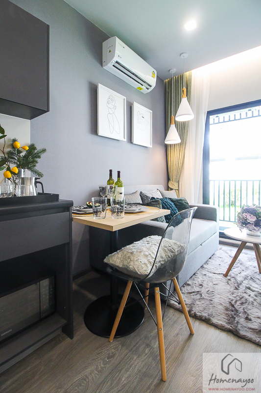 ส่วนพื้นที่ที่เหลือก็สามารถจัดสรรได้ตามใจ อย่างในห้องตัวอย่างเค้าก็แบ่งเป็นมุมทานข้าว 2 ที่นั่ง และมุมนั่งเล่น ก็จัดมาครบฟังก์ชั่น กระทัดรัดดีค่ะ