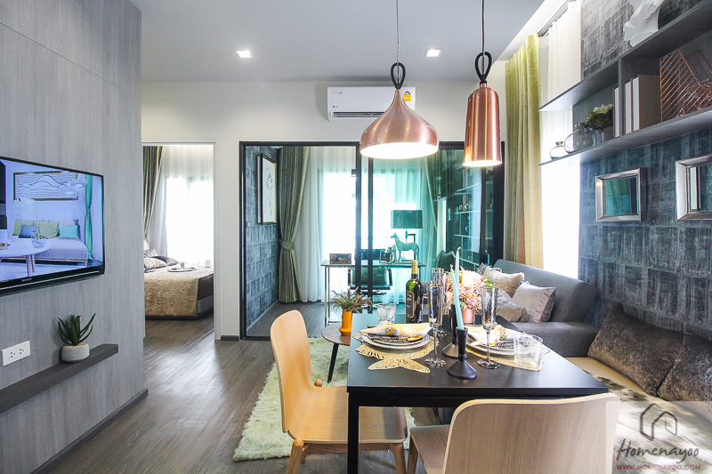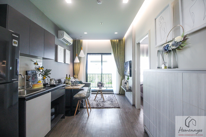 ห้องนี้ก็จะมีขนาดกว้างขึ้น อยู่ได้ 2 คนสบายๆค่ะ เข้ามาในห้องส่วนแรกเป็นพื้นที่โถงส่วนกลาง แบ่งพื้นที่เป็นครัวเปิด, มุมทานอาหารและห้องนั่งเล่น