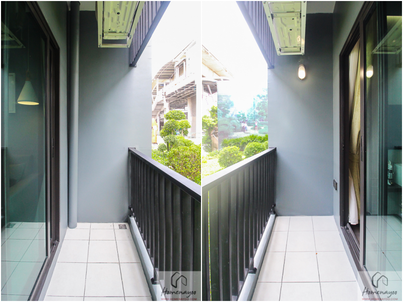 คอมเพรสเซอร์แอร์ยกขึ้นไปด้านบน พื้นที่ระเบียงใช้ได้เต็มที่ค่ะ