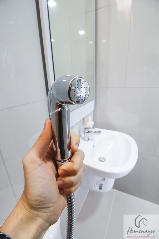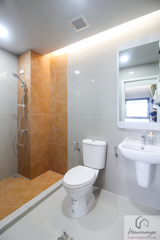 ส่วนพื้นที่อาบน้ำจะมีธรณีก่อขึ้นมาเพื่อกันน้ำไหลออกไปพื้นที่ส่วนแห้ง ของจริงไม่มี Shower Box ติดตั้งมาให้นะ ตรงนี้ติด Shower Box เพิ่มก็ดีค่ะ หรือถ้าใครประหยัดงบ ก็ใช้ม่านกั้นอาบน้ำแทนได้ ด้านในติดตั้งฝักบัว พร้อมเดินระบบรองรับการติดตั้งเครื่องทำน้ำอุ่นมาให้เรียบร้อย