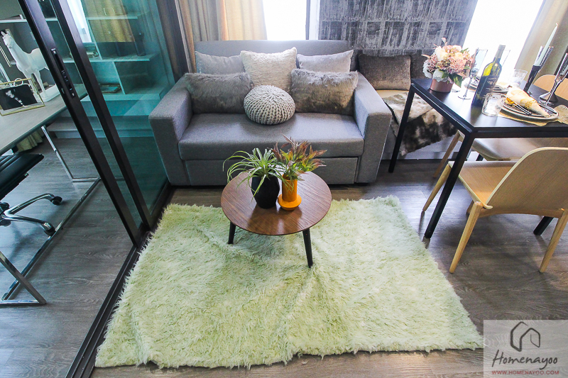 มุมห้องนั่งเล่นทางโครงการจัดมาให้ดูเป็นโซฟาเบด 2 – 3 ที่นั่ง ระยะกำลังพอดี