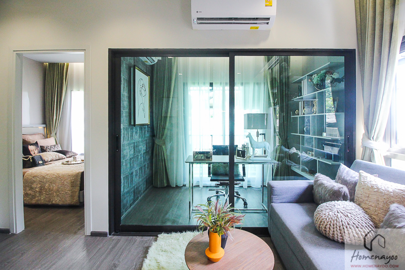 อย่างในห้องตัวอย่าง จัดมาเป็นห้องทำงาน สามารถวางโต๊ะไซส์กลางๆ และทำชั้นวางของได้