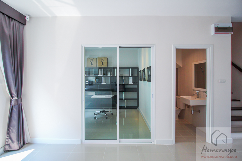 ด้านในห้องนอน 4 บ้านตัวอย่างตกแต่งเป็นห้องทำงานให้ดู ขนาดห้องประมาณ 2.91 x 2.86 ม. ใครจะทำเป็นห้องนอน ห้องดูหนัง หรือห้องเก็บของก็ได้