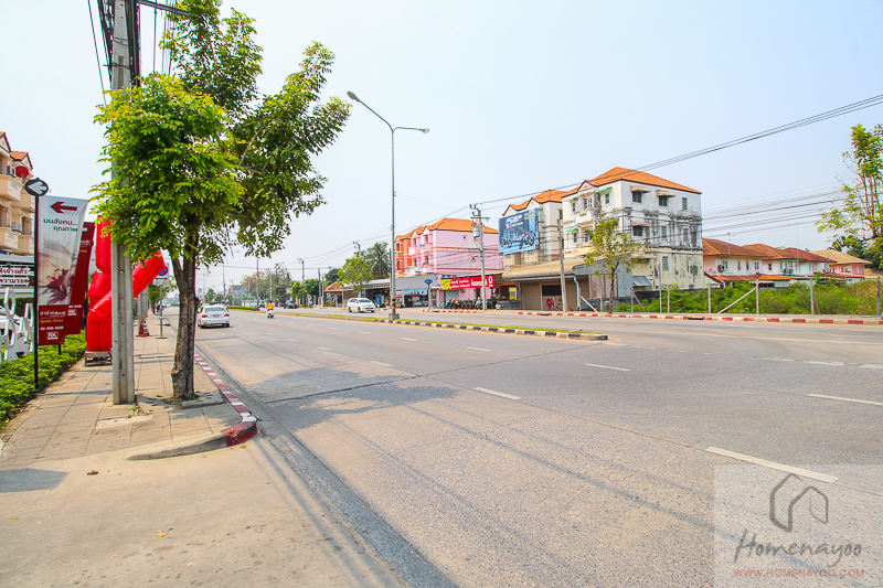 ด้านหน้าโครงการติดถนนเลียบคลองสอง ฝั่งมุ่งหน้าไปคู้บอน ขอบเขตหน้าโครงการคือเส้นสีแดง