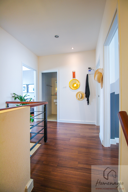 ขึ้นชั้นสองมาจะเจอโถงบันไดก่อน พื้นชั้นสองเป็นไม้ลามิเนตหนา 8 มม. ซ้ายมือเป็นห้อง Master Bedroom ตรงกลางเป็นห้องน้ำ ขวามือเป็นห้องนอน 2 และ 3