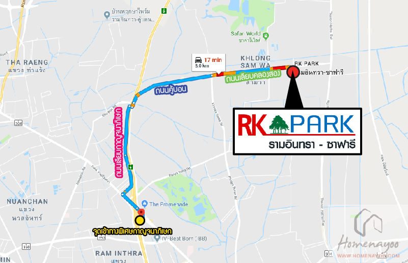 ทำเลที่ตั้งโครงการ – RK Park รามอินทรา-ซาฟารี เป็นโครงการที่ตั้งอยู่ในย่านที่พักอาศัย เห็นได้จากรอบๆโครงการส่วนใหญ่จะเป็นหมู่บ้านพักอาศัยทั้งบ้านจัดสรร อาคารพาณิชย์ แต่ก็ยังมีพื้นที่ว่างเปล่าอยู่ ความอุดมสมบูรณ์ย่านนี้ตามริมสองฝั่งทางถนนเลียบคลองสอง และถนนคู้บอนจะมีร้านค้า ร้านอาหารให้เลือกพอสมควร มีตลาดสดใกล้อย่างตลาดพระพรหมคลองสองและตลาดหทัยมิตร เลยโครงการไปหน่อยมี Big C ถ้าออกมาเส้นรามอินทราจะมี Fashion Island, The Promenade, Big C, Makro, Central รามอินทรา Tesco Lotus มีตรงเส้นพหลโยธินครับ ตรงเส้นเกษตร-นวมินทร์มี Chocolate Ville แถวเส้นเลียบด่วนรามอินทราจะมีตลาดนัดให้เดินช้อปปิ้งและเลือกซื้ออาหารกันได้