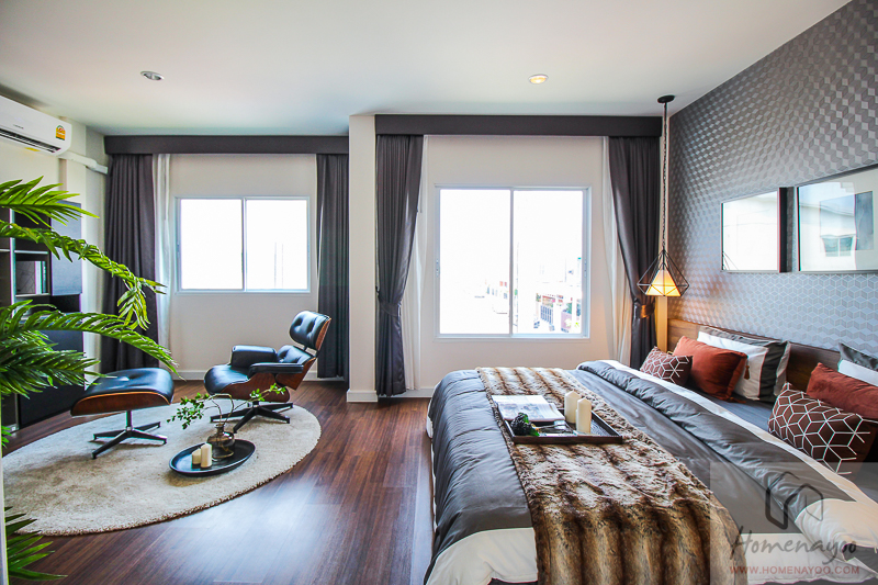 พื้นที่ปลายเตียงบ้านตัวอย่างวางอาร์มแชร์ หรือจะวางโซฟาได้อีก