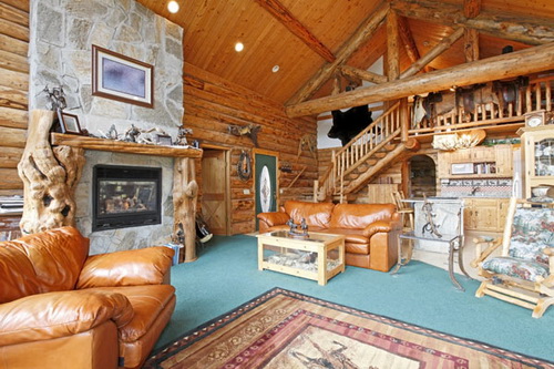 19. ห้องรับแขกไม้เหมือนบ้านสไตล์คันทรี่ยุคโบราณ โชว์ความขรุขระตามธรรมชาติของเนื้อไม้ กับโซฟาหนังและพรมลายอินเดียแดง อบอุ่นด้วยเตาผิงตกแต่งด้วยหินแม้จะดูเทอะทะแต่ก็แข็งแกร่ง