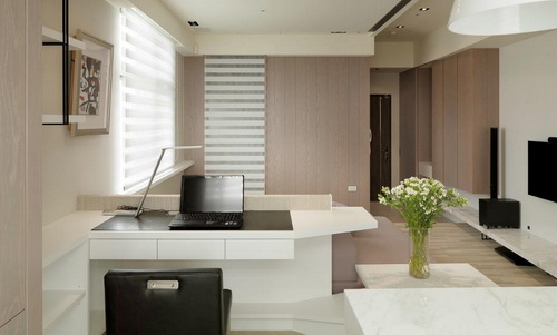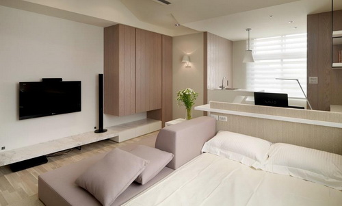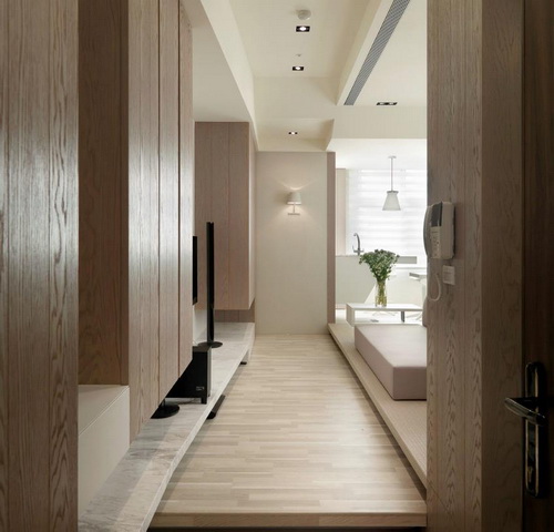 นอกจากการนำเอาสีไม้อ่อน ๆ มาใช้เป็นพื้นและหน้าบานตู้ต่าง ๆ แล้ว ยังนำเอาหินอ่อนสีขาวมาผสมผสาน เป็นเคาน์เตอร์ครัว เป็นชั้นใต้ทีวี ดูเรียบหรูกลมกลืน ให้บรรยากาศที่อบอุ่นสบายน่าอยู่มากเลยค่ะ ผู้ที่กำลังมองหาแบบสำหรับตกแต่งภายในคอนโดมิเนียมขนาดห้องสตูดิโอเห็นแล้วน่าจะชอบเลยทีเดียวนะคะ