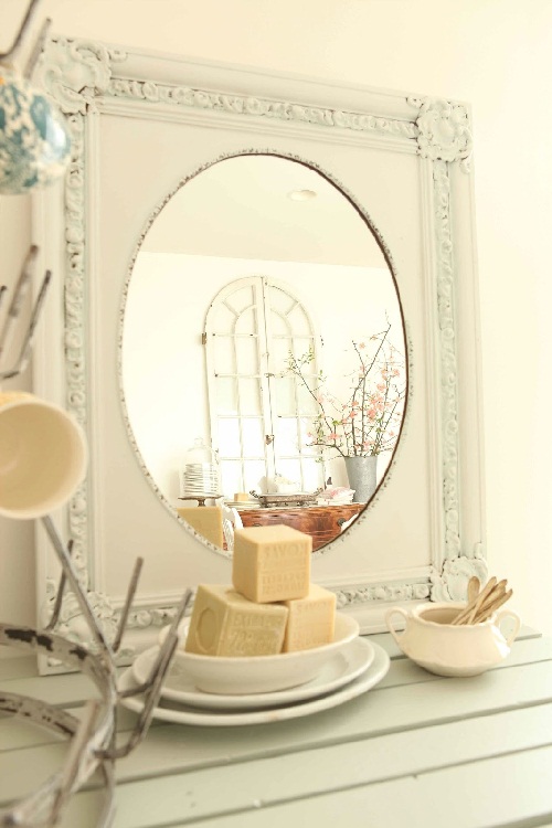 ด้านในสุดของห้องเป็นการนำเอาพาเลทเก่ามาทำสีขาว แล้วขึ้นรูปเป็นโต๊ะเสียใหม่ จัดวางกระจกทรงรีไว้เหมือนโต๊ะเครื่องแป้ง ที่สวยน่ารักเห็นจะเห็นพวงสำหรับแขวนถ้วยชาเป็นชุดแบบโบราณ และบรรดาของตกแต่งที่จัดเรียงไว้ในตู้นั่นเองค่ะ เป็นห้องรับประทานอาหารที่คุณสามารถนำเอาของเดิมในบ้านมามิกซ์แอนด์แมทช์ได้อีกมาก ตามต้องการเลยทีเดียว