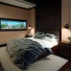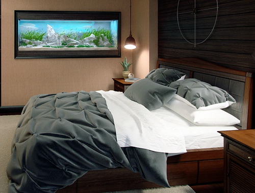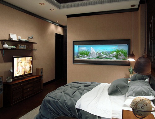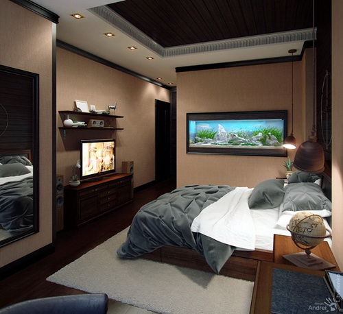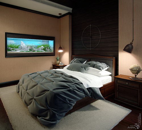 เพิ่มความน่าสนใจและสดชื่นมากขึ้นด้วยตู้ปลาแบบติดตั้งบนผนัง ทำให้ห้องนอนดูสดชื่นและมีสีสันขึ้นอีกมาก บนเตียงนอนเลือกใช้ผ้าปูนที่นอนสีขาวสะอาดคลุมด้วยผ้าคลุมเตียงสีเทาเข้ม เข้าชุดกับปลอกหมอน ข้างเตียงติดตั้งโคมไฟที่ห้อยลงมาจากเพดานเป็นไฟหัวเตียงสำหรับอ่านหนังสือได้แบบสบาย ๆ นับเป็นตัวอย่างห้องนอนที่น่าสนใจมากสำหรับชายหนุ่มที่ใช้ชีวิตในเมืองใหญ่หรือในคอนโดมิเนียมเลยล่ะค่ะ