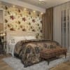 ห้องนอนห้องนี้เลือกใช้โทนสีน้ำตาล-ครีมเป็นหลัก แต่เน้นตรงเพิ่มความเรืองรองด้วยสีทองและแสงไฟที่นุ่มนวลเพิ่มขึ้นมา เลือกปูพื้นด้วยพื้นไม้สีอ่อนโชว์ตาไม้ที่ชัดเจน ผนังห้องด้านหลังเตียงเลือกใช้วอลล์เปเปอร์ลายดอกไม้พื้นสีครีมดอกสีม่วง ดูสวยหรูกำลังดี ส่วนเตียงเลือกใช้เตียงไม้สไตล์คลาสสิกสีครีม คลุมด้วยผ้าคลุมเตียงสีน้ำตาลทองสวยด้วยลายดอกไม้อีกเช่นกัน