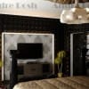 การตกแต่งภายในห้องก็ยังเน้นความหรูของสีทองตัดกับสีดำเป็นหลัก เช่น ผนังด้านที่ติดตั้งทีวีเป็นต้น เป็นผนังที่กรุวอลล์เปเปอร์สีขาวมีลวดลายเดินเส้นสีทองสีเงินอย่างแวววาวเป็นพื้น รอบ ๆ เป็นวัสดุตกแต่งผนังที่นูนเป็นสามมิติเหมือนหนามแหลมสีดำเป็นแผงขนาดใหญ่ ลงตัวกันพอดีกับตู้โชว์หน้าทีวีเลยล่ะค่ะ ใครที่อยากมีห้องนอนแปลกตาเกินใครจะลองไปหาซื้อเฟอร์นิเจอร์แนวนี้มาประดับบ้านตามก็ได้นะคะ รับรองบ้านและห้องนอนของคุณจะโดดเด่นเกินหน้าใครแน่นอนเลยล่ะค่ะ