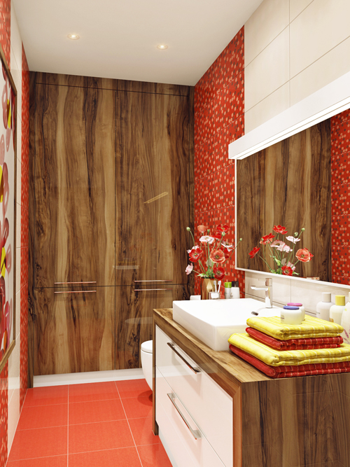 การตกแต่งภายในห้องนี้เน้นเอาสีแดงเป็นหลักกระเบื้องปูผนังภายในห้องน้ำมีทั้งที่เป็นสีแดงลายจุด สลับกับสีขาวปูในแนวตั้ง พื้นห้องน้ำเป็นสีแดงอมส้มที่มีเฉดที่อ่อนกว่าผนังลงมาเล็กน้อย ติดรูปภาพลายดอกไม้สีโทนแดงส้มขาว คล้ายสีของกระเบื้องปูผนังและปูพื้น