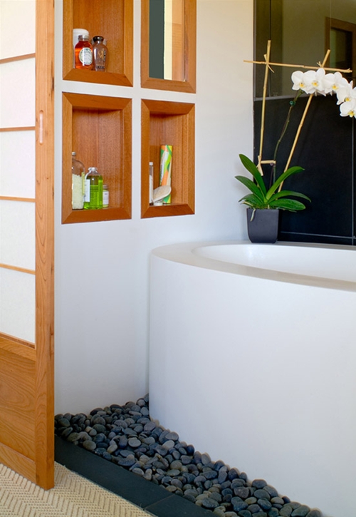 5. กรวดหินสีขาวดำทรงรี ๆ ด้วยความเย็นและเป็นวัสดุที่มาจากธรรมชาติจึงให้อารมณ์ของห้องน้ำสไตล์เซนได้อย่างเต็มเปี่ยม