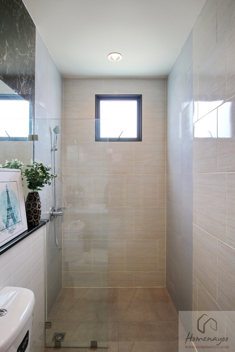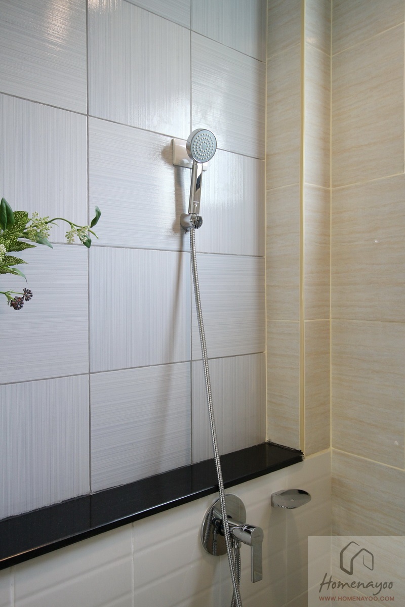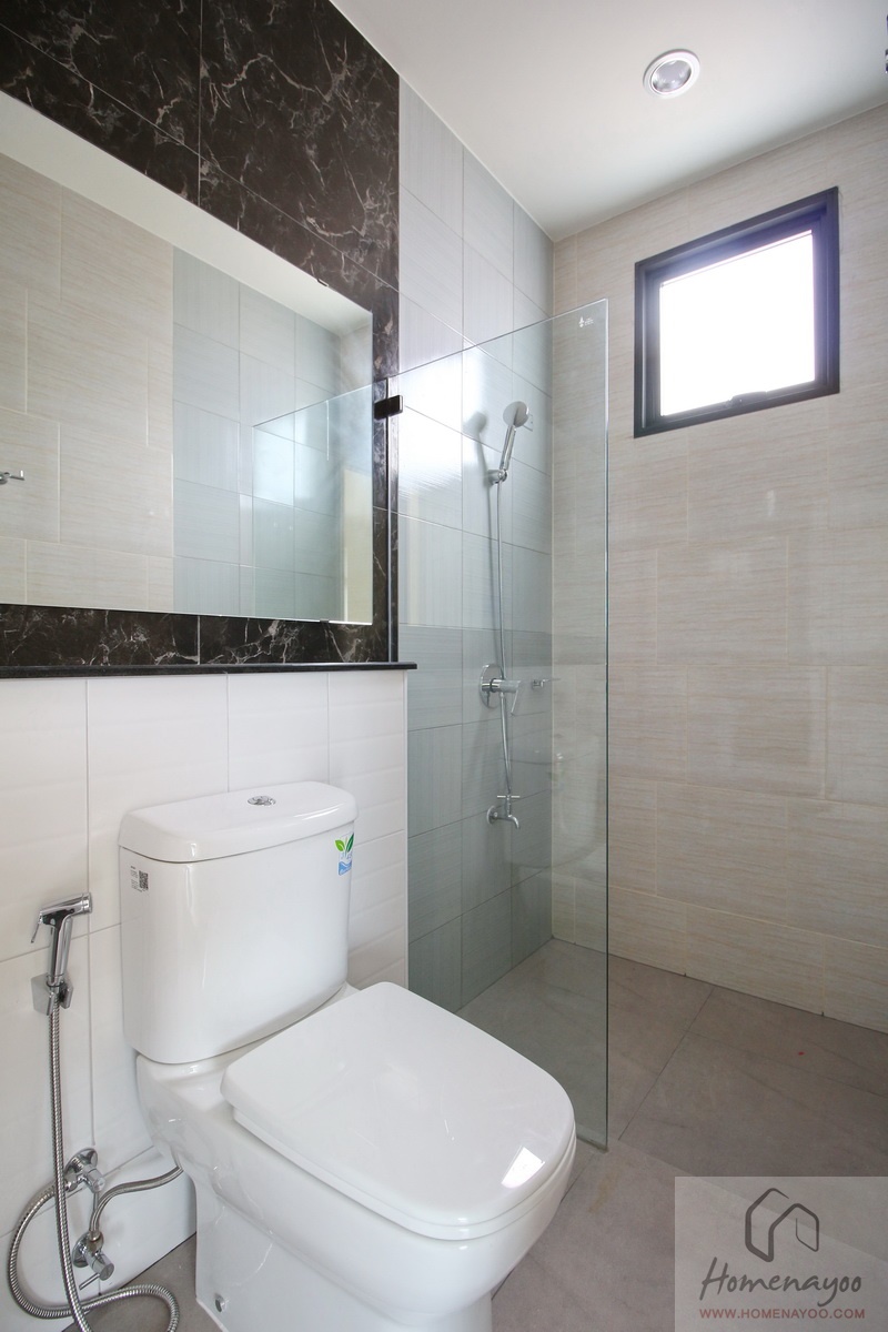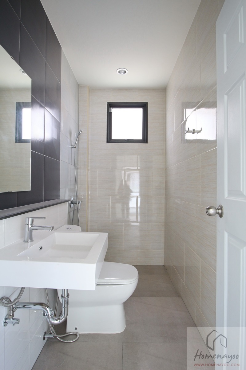 ห้องน้ำแบบแนวยาว แบ่งส่วนแห้ง ส่วนอาบน้ำให้เรียบร้อย วัสดุสุขภัณฑ์ภายในได้เหมือนกันทั้งโครงการค่ะ