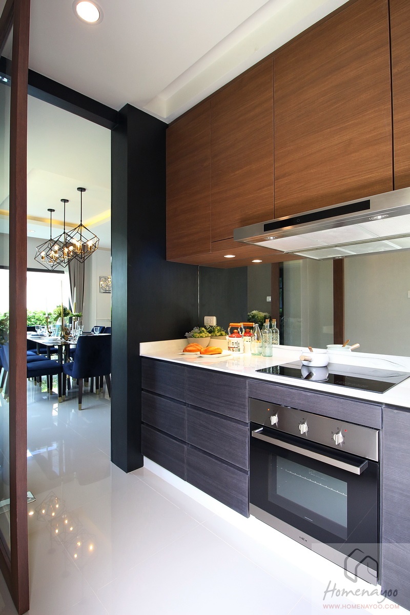 ห้องครัวแบบเปิด ทางโครงการเตรียมพื้นที่และงานระบบไว้ให้ ลูกค้าสามารถต่อเติมกั้นประตูเพิ่มเติมเองได้ง่าย