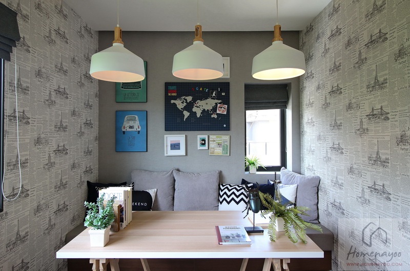ผนังด้านหลังบิวท์อินโต๊ะทำงานแบบหน้ากว้าง นั่งได้ 2-3 ที่นั่ง มุมนี้จะได้แสงธรรมชาติจากหน้าต่างบานใหญ่ด้านหลัง เวลาเด็ก ๆ นั่งทำการบ้าน อ่านหนังสือ ก็จะได้แสงสว่างที่เพียงพอต่อการใช้งาน