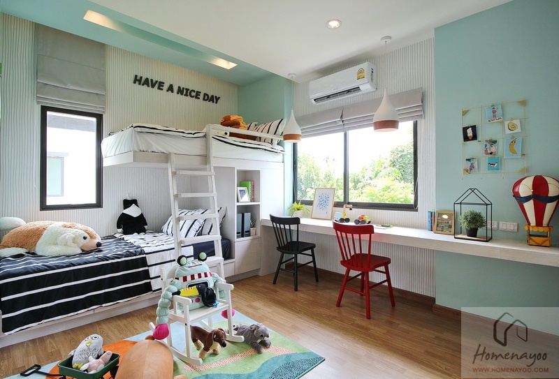 มุมห้องฝั่งนี้วางเตียงนอน 2 ชั้น ขนาด 3.5 ฟุต ให้ดูระยะใช้งาน บ้านจริงสามารถเพิ่มเป็น 5-6 ฟุต ได้เลย