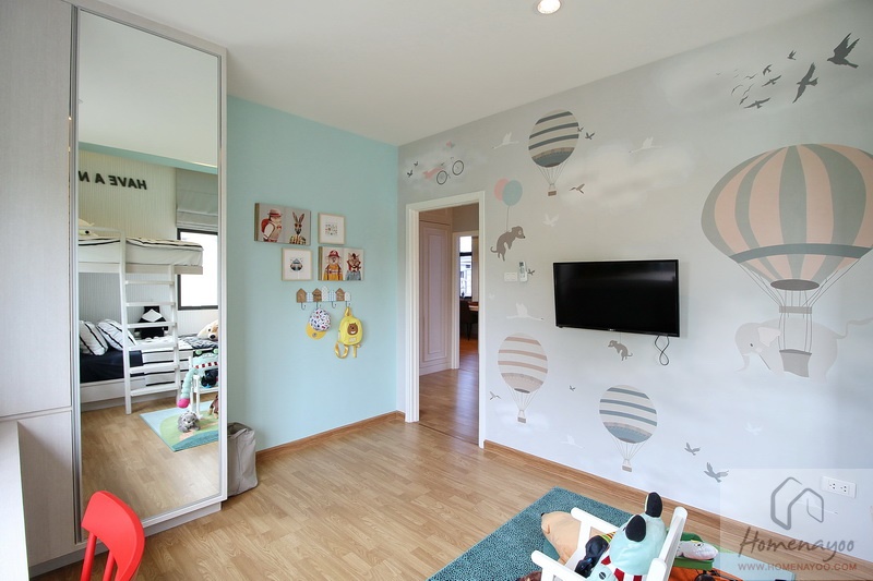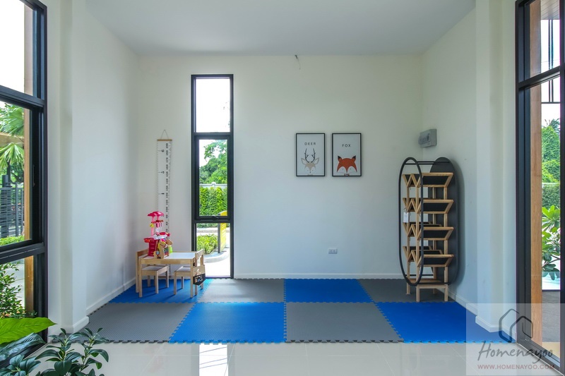 มองย้อนกลับมาที่หน้าห้องนอน 2 จะเห็นได้ว่ามีพื้นที่ตรงกลางเหลือกว้าง เด็ก ๆ เล่นของเล่น นั่งทำกิจกรรมต่าง ๆ ได้อย่างสบาย ๆ ค่ะ