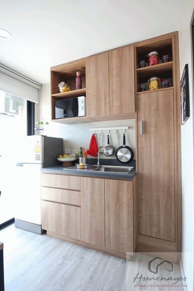 ส่วนเคาน์เตอร์ครัวที่ได้ก็จะขนาดใหญ่ขึ้นค่ะโดย Build In เป็นรูปตัว L ไปกับผนัง และมีตู้เก็บของเหนือศีรษะ สามารถเก็บของได้จุใจเลยค่ะ ข้างเคาน์เตอร์ครัวสามารถวางตู้เย็นขนาด 5.9 คิวได้ 1 ตัว